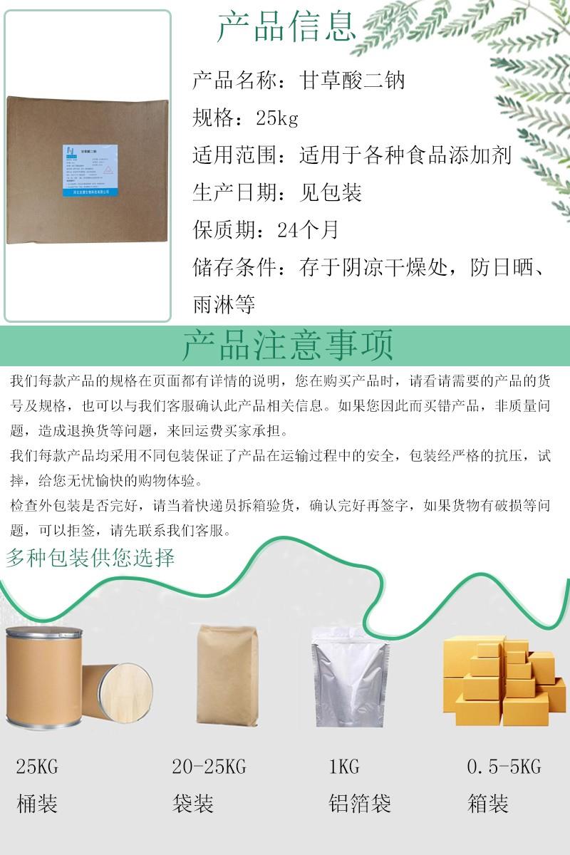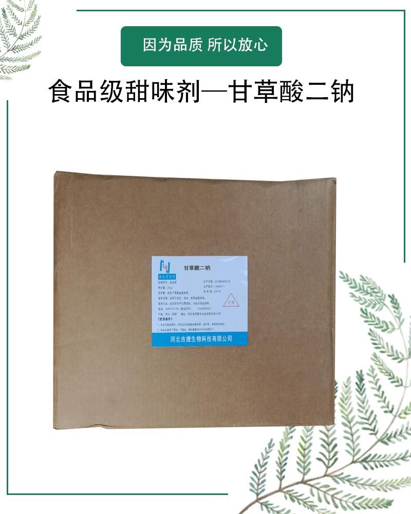 甘草酸二钠为白色或者淡黄色粉末,味极甜,余味有特殊的甜味。甘草酸二钠还有增香效果,可作为食用香料的增香剂,对乳制品、可可制品等效果较好。将甘草粉碎,用水抽提,浓缩成黑褐色粘稠液,再用稀乙醇精制得甘草酸结晶,必要时可加人活性炭脱色。然后再将其转化成二钠盐即得产品甘草酸二钠。甘草酸二钠盐是一种天然食品甜味剂,从天然植物甘草中提取经特殊工艺加工而成。主要成分为甘草酸,甜度是蔗糖的200-300倍,在水中非常易溶解,溶液澄清透明,无杂质和怪味,口感好。食品应用:糖果糕饼:各种软糖、硬糖、高粱饴、牛皮糖、巧克力、各种饼干、各式西点、羊羹、月饼、汤团馅以及各种饼馅。甜点心:布丁、凝胶食品等冷饮品:各式雪糕、冰棒、冰淇淋等。焙烤食品:面包、蛋糕等。此外,还可作为畜肉加工品、水产制品、果酱油、蜂蜜加工品等的配料。
