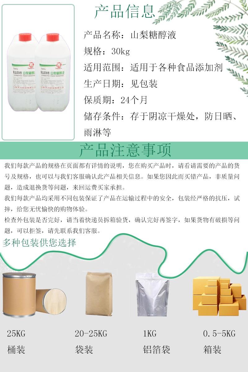 山梨糖醇为白色吸湿性粉末或晶状粉末、片状或颗粒,无臭。依结晶条件不同,熔点在88~102℃范围内变化,相对密度约1.49。易溶于水(1g 溶于约0.45mL水中),微溶于乙醇和乙酸。有清凉的甜味,甜度约为蔗糖的一半,热值与蔗糖相近。