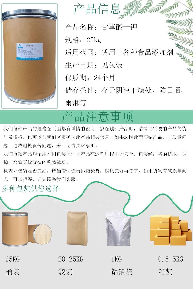 二、性状类白色至淡黄色粉末,无臭,有特殊甜味,甜度约为蔗糖500倍,留甜时间长。易溶于水三、用途可按生产需要适量用于肉类罐头、调味料、糖果、饼干、蜜饯、凉果、果汁(味)型饮料,具体用量参见甘草。食品级甘草酸钾厂家 甘草酸钾价格甘草酸钾 (68039-19-0)以甘草酸粗品为原料,用中和,经精制而得。甘草酸钾 (68039-19-0)的质量指标(参考标准):含量(UV法,以干品计)≥98%,或(HPLC法,以干品计)≥85%;灰分≤9.63%;水中不溶物≤0.5%;重金属≤0.001%;砷盐≤0.0002%;比旋光度αD20为+43.3°