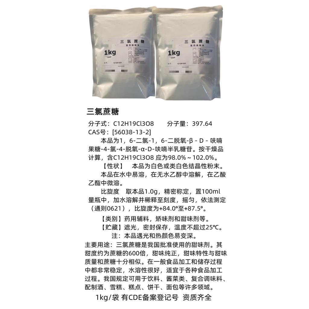 C12H19Cl3O8 397.64 [56038-13-2] 本品为1,6-二氯-1,6-二脱氧-β-D-呋喃果糖-4-氯-4-脱氧-α-D-呋喃半乳糖苷。按干燥品计算,含C12H19Cl3O8 应为98.0%~102.0%。 【性状】 本品为白色或类白色结晶性粉末。 本品在水中易溶,在无水乙醇中溶解,在乙酸乙酯中微溶。 比旋度 取本品1.0g,精密称定,置100ml量瓶中,加水溶解并稀释至刻度,摇匀,依法测定(通则0621),比旋度为+84.0°至+87.5°。 水分 取本品0.5g,照水分测定法(通则0832法)测定,含水分不得过2.0%。 炽灼残渣 取本品1.0g,依法检查(通则0841),遗留残渣不得过0.7%。 重金属 取炽灼残渣项下遗留的残渣,依法检查(通则0821第二法),含重金属不得过百万分之十。 【含量测定】 照高效液相色谱法(通则0512)测定。 色谱条件与系统适用性试验 用十八烷基硅烷键合硅胶为填充剂,以水-乙腈(85∶15)为流动相,示差折光检测器,流速为每分钟1.0ml。理论板数按三氯蔗糖峰计算不低于2000。 测定法 取本品适量,精密称定,加流动相溶解并定量稀释制成每1ml中含10mg的溶液,作为供试品溶液,精密量取20μl注入液相色谱仪,记录色谱图;另取三氯蔗糖对照品,同法测定。按外标法以峰面积计算,即得。 【类别】药用辅料,矫味剂和甜味剂等。 【贮藏】遮光,密封保存,温度不超过25℃。 注:本品遇光和热颜色易变深。