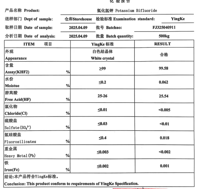 氟氢化钾英文名称——potassium bifluoride中文别名——二氟氢化钾;氟化氢钾CAS 号——7789-29-9分 子 式——HFK分 子 量——59.1041性 状——无色四方或立方结晶。略带酸臭味。双晶化合物。熔 点——225℃(分解)密 度——2.37溶 解 性——易溶于水,可溶于醋酸钾,不溶于乙醇。水溶液呈酸性含 量——99%包装——25公斤用 途——用于制造无水氟化氢、纯氟化钾、元素氟生产的电解质。也用于制造光学玻璃、蚀绘玻璃。可用作银制品的焊接助熔剂、木材的防腐剂、掩蔽剂及苯烷基化的催化剂等关键词:氟氢化钾厂家、氟氢化钾湖北厂家、氟氢化钾湖北现货