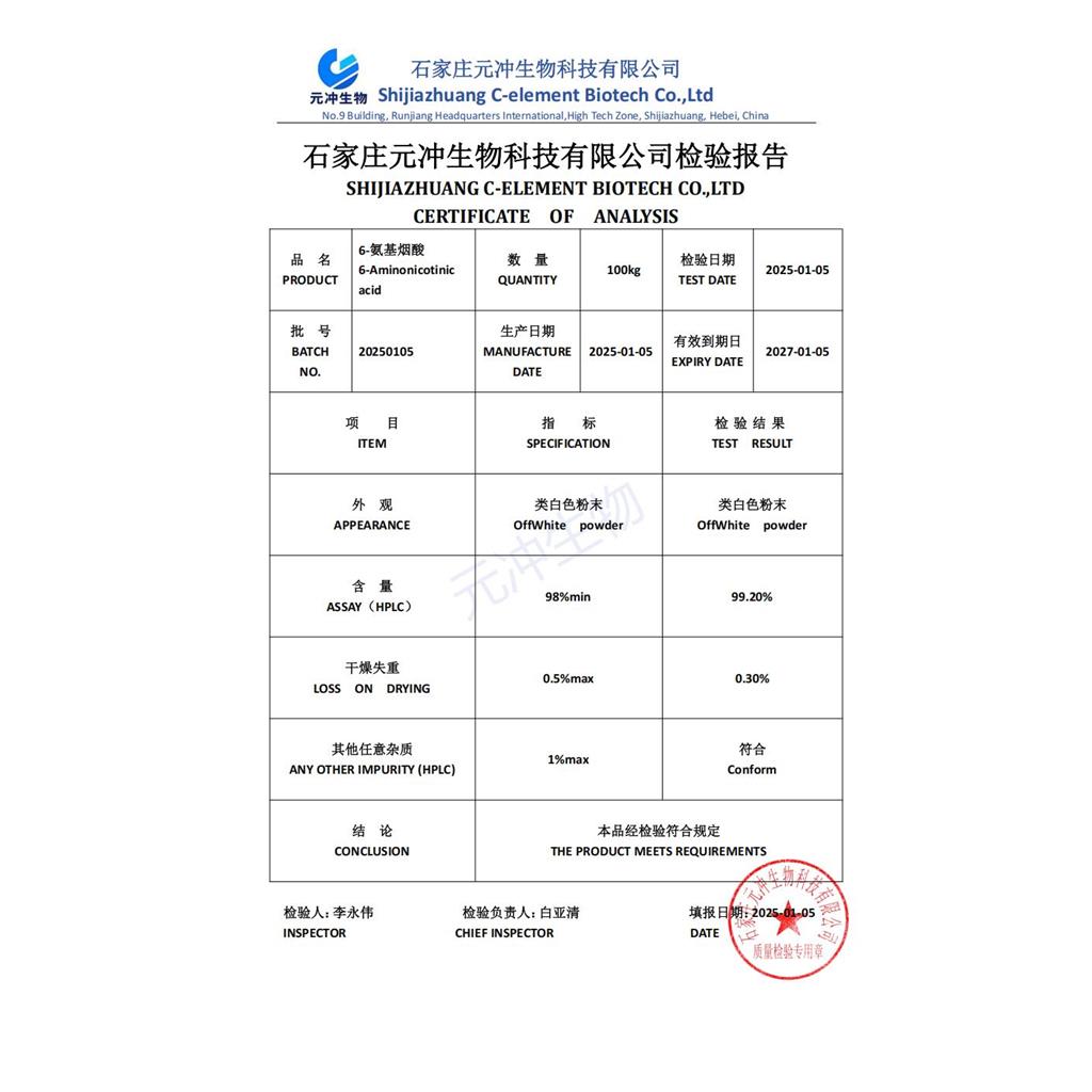 石家庄元冲生物科技有限公司专业生产:2-氨基烟酸,2-巯基烟酸,2-氯-4-氨基吡啶,5-羟基烟酸,5-羟基烟酸甲酯,5-氨基烟酸,丁烯基苯酞,匹维溴铵中间体,1-萘磺酸钠,香芹酚,乙醛酸一水合物,2,5-己二酮等产品。