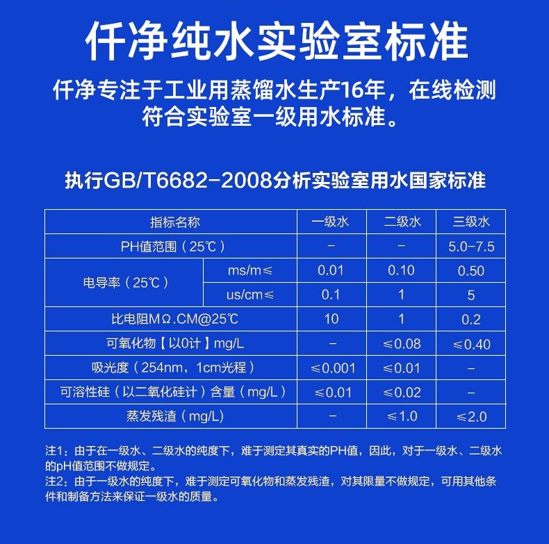 仟净牌工业蒸馏水,是采用纯水再经多级蒸馏水,源水煮沸后令其蒸发冷凝回收,要大量耗费热能,用于制作蒸馏水的源水中的其它遇热蒸发物质,也就随着蒸馏水的生成而冷凝到蒸馏水中,如对健康有害的酚类、苯化合物,甚至可蒸发的汞等。要想得到纯净水或超纯水,必须经过二次、三次的蒸馏还得增加其它蒸馏水提纯的手段。