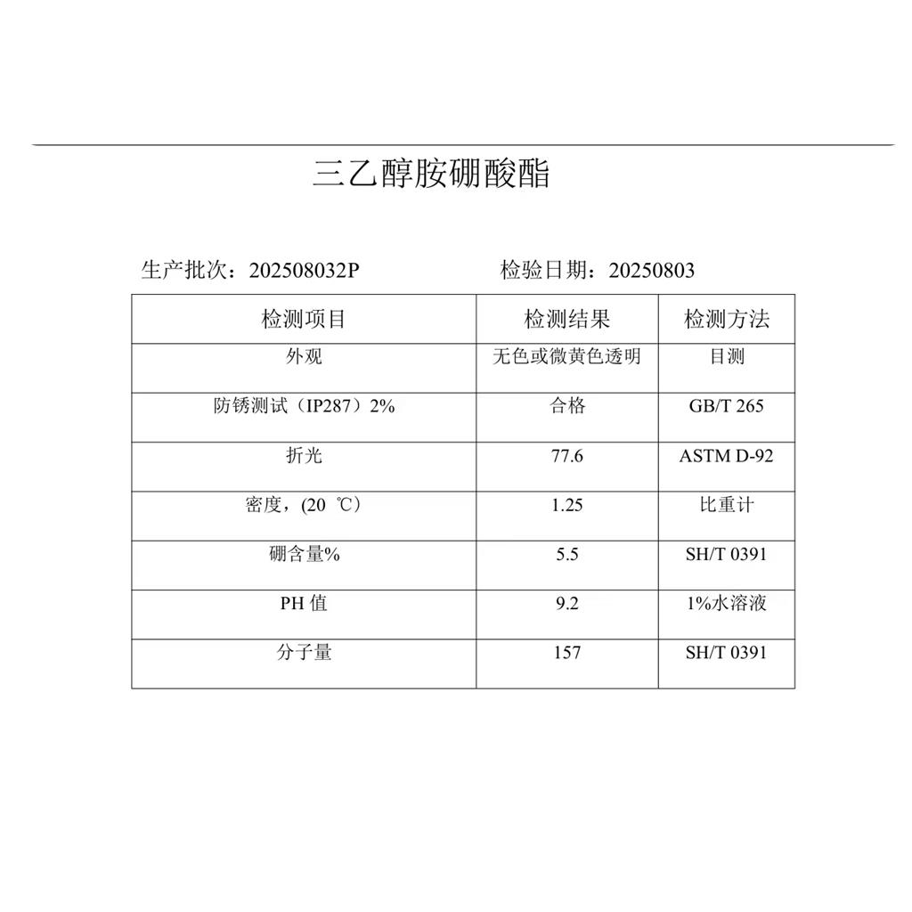 三乙醇胺硼酸盐可用作有机合成中间体和医药中间体,主要用于实验室研发过程和化工生产过程中。防锈缓蚀剂三乙醇胺硼酸酯是一种水溶性防锈缓蚀剂,能很好地应用于工业金属制件加工过程中,对金属制件起到防锈的效果。经实验可知,浓度较低时,三乙醇胺硼酸酯溶液具有较好的防锈效果;浓度0.5%时,对20钢有良好的防锈效果;0.6%时,对45钢有较好的防锈效果;0.8%时,对灰口铸铁有较好的防锈效果;2.5%时,对20钢、45钢、灰口铸铁具有很好的防锈性能,可应用于防锈行业中。三乙醇胺硼酸酯可以增大硼酸酯的水解稳定性,三乙醇胺硼酸酯作为一种高效的金属防锈剂 切削液添加剂:润滑剂:阻燃剂