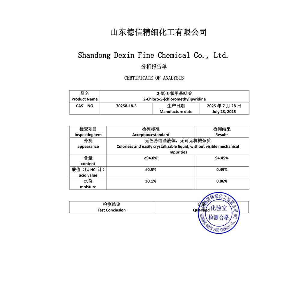 2-氯-5-氯甲基吡啶(简称CCMP)是一种重要的医药中间体和合成吡啶类农药原药如吡虫啉(imidacloprid)、啶虫脒(acetamiprid)、氟啶胺(fluazinam)等的重要中间体。2-氯-5-氯甲基吡啶纯品为无色结晶,m.p.35~36℃,b.p.88~90℃/400pa,工业品为橘红色液体或黏稠状,有刺激性气味,溶于多种有机溶剂,弱碱性,溶于有机酸。2-氯-5-氯甲基吡啶是杀虫剂吡虫啉、啶虫脒的中间体。