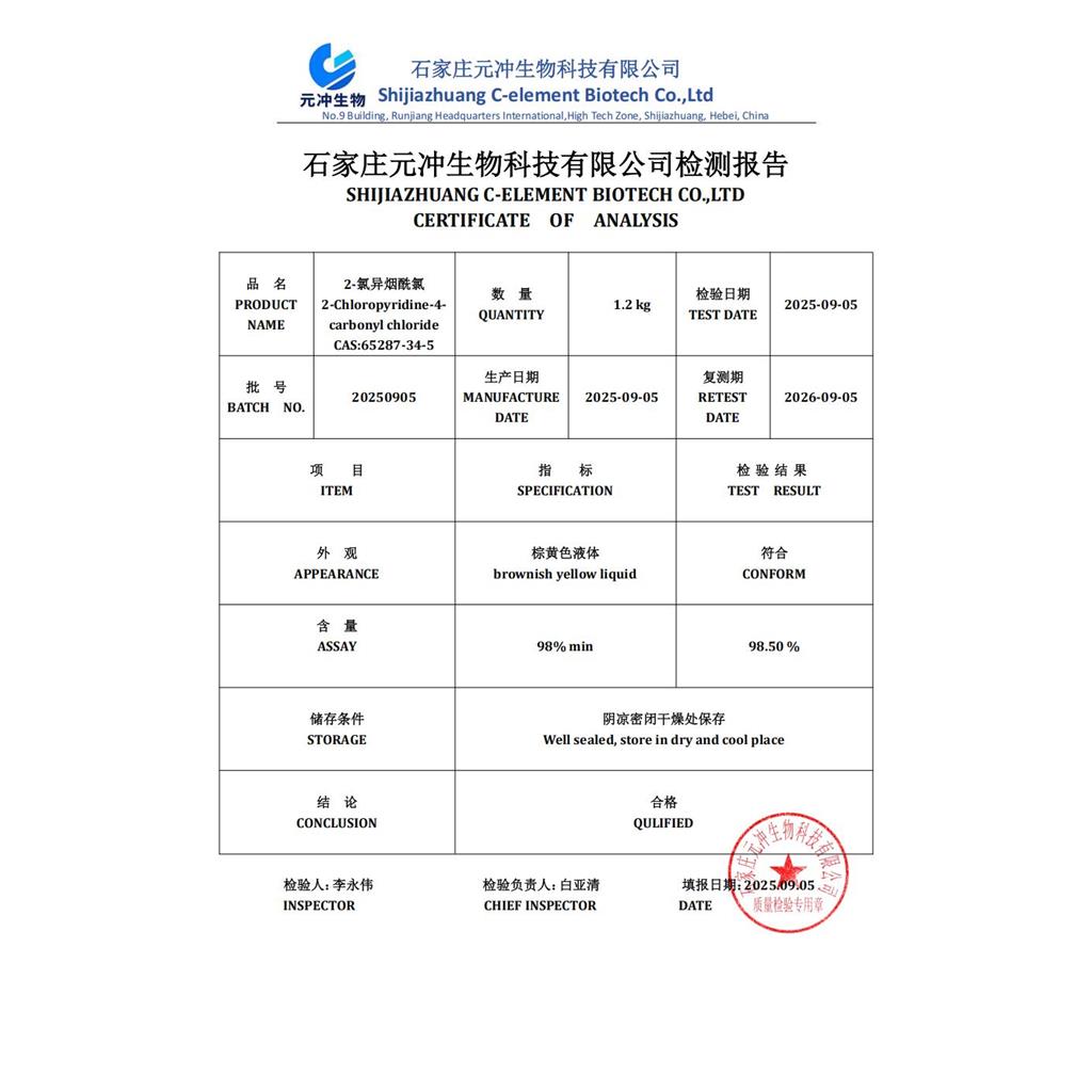 关键字: 2-氯吡啶-4-甲酰氯;2-氯异烟酰氯;65287-34-5;2-Chloropyridine-4-c;石家庄元冲生物科技有限公司;