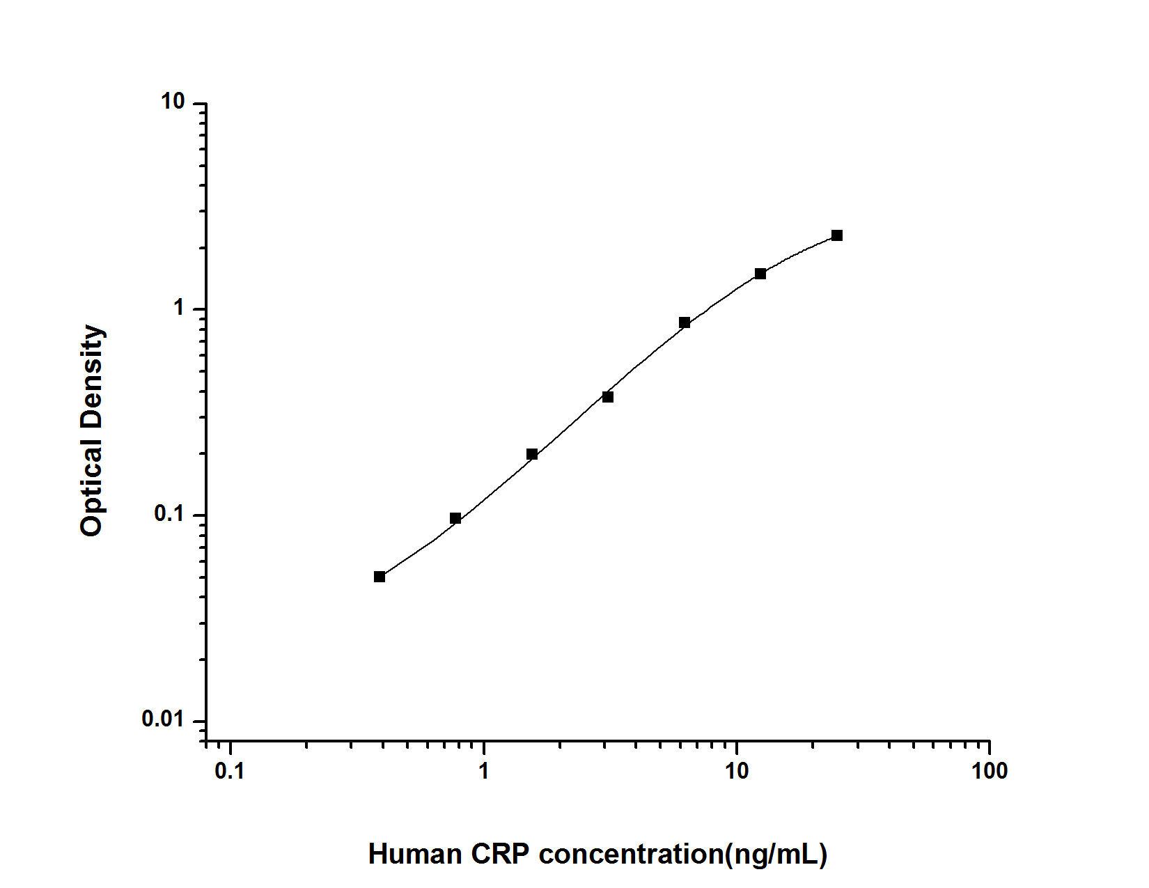 本试剂盒采用双抗体夹心ELISA法。用抗人 CRP抗体包被于酶标板上,实验时样品(或标准品)及生物素化的抗人CRP抗体同时加入酶标板中,样本(或标准品)中的人CRP会与包被抗体结合,同时抗人CRP抗体与结合在包被抗体上的人 CRP结合,游离的成分被洗去。再加入辣根过氧化物酶标记的亲和素,生物素与亲和素特异性结合而形成免疫复合物,游离的成分被洗去。加入显色底物(TMB),TMB在辣根过氧化物酶的催化下呈现蓝色,加终止液后变成黄色。用酶标仪在450nm波长处测OD值,CRP浓度与OD450值之间呈正比,通过绘制标准曲线计算出样品中CRP的浓度。