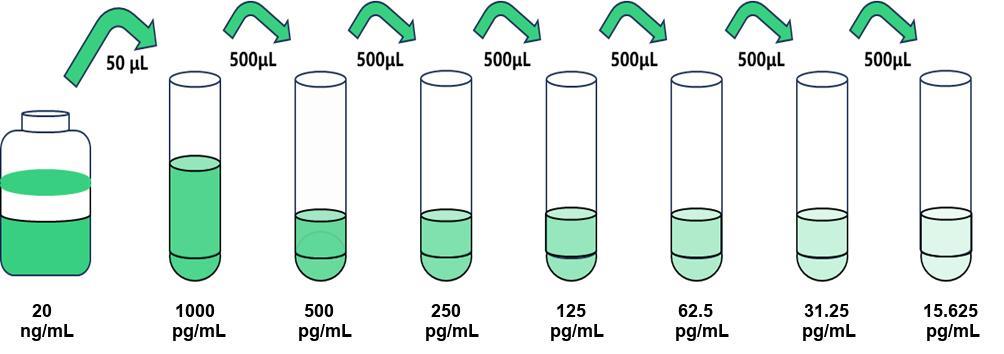 试剂盒中取出标准品,准备7个试管,先从20ng/mL标准品(200μL)按需吸取一定量用1×稀释液稀释至1000pg/mL(例:50μL的标准品母液+950μL的1×稀释液,制备得到1000μL的1000pg/mL浓度标准品),随后在6个试管中分别加入500μL的1×稀释液,在这6个单独的试管中将1000pg/mL标准品依次2倍倍比稀释至6个梯度,共配制7个浓度的标准品,依次为:1000pg/mL、500pg/mL、250pg/mL、125pg/mL、62.5pg/mL、31.25pg/mL、15.625pg/mL,从最高浓度标准品溶液中吸取500μL标准品到下一个试管中,轻轻吹打混匀,以此类推进行标准品的倍比稀释(如图所示),1×稀释液用作零浓度标准品(0pg/mL)。