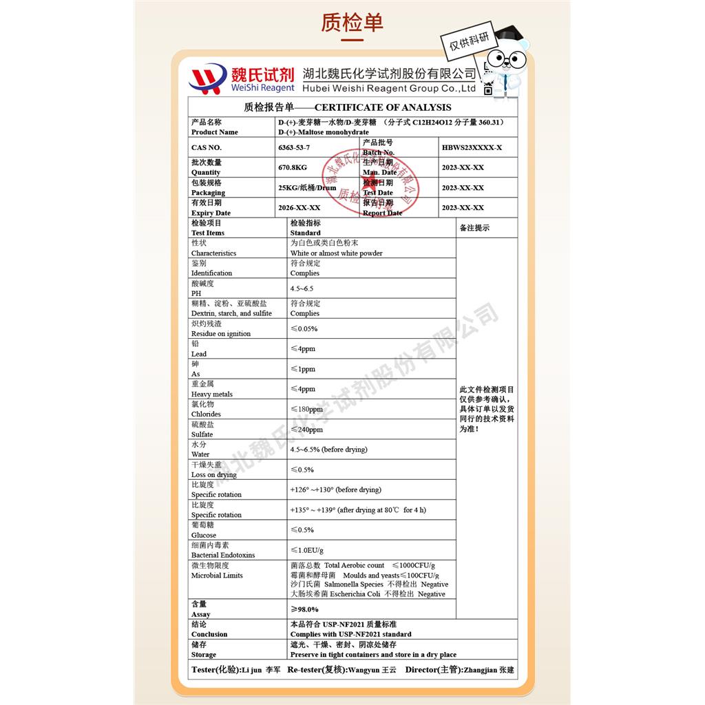 关键字: 麦芽糖一水物;6363-53-7;D-( )-Maltose monohy;魏氏试剂;