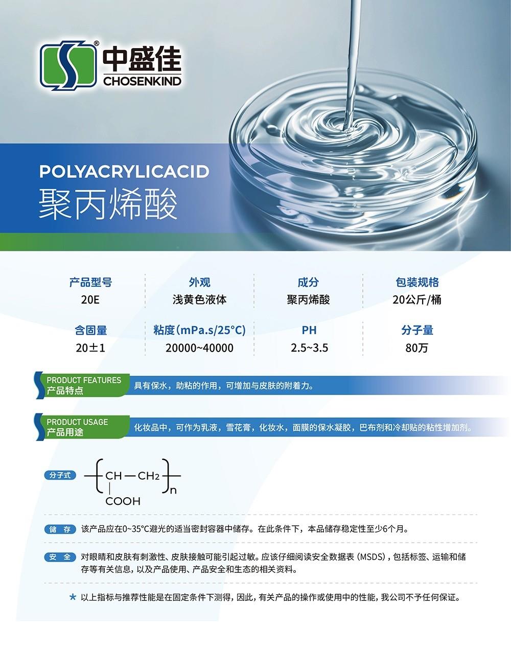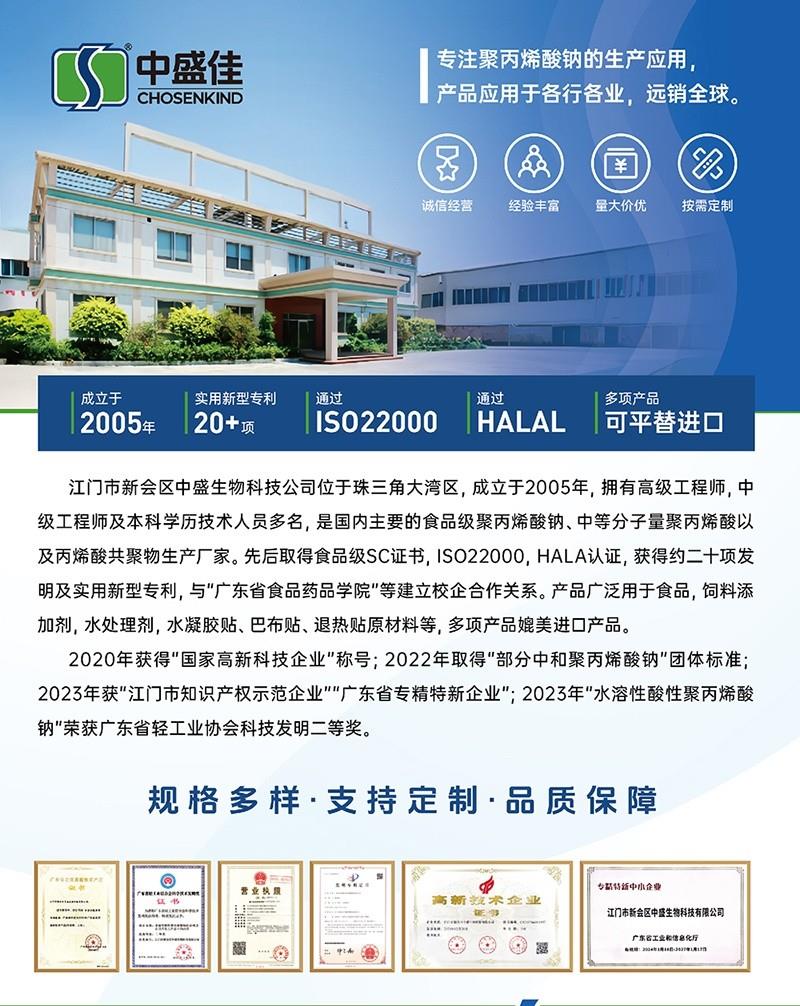 江门市新会区中盛生物科技公司位于珠三角大湾区,成立于2005年,拥有高级工程师,中级工程师及本科学历技术人员多名,是国内主要的食品级聚丙烯酸钠、中等分子量聚丙烯酸以及丙烯酸共聚物生产厂家。先后取得食品级SC证书,ISO22000,HALA认证,获得约二十项发明及实用新型专利,与"广东省食品药品学院"等建立校企合作关系。产品广泛用于食品,饲料添加剂,水处理剂,水凝胶贴、巴布贴、退热贴原材料等,多项产品媲美进口产品。