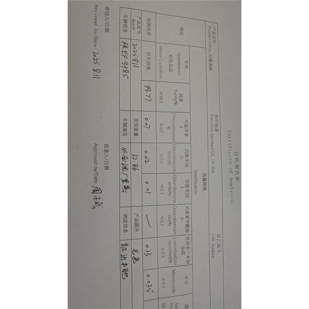 对氯苯甲腈(4-氯苯甲腈),化学式C7H4ClN,分子量137.57,CAS号623-03-0,是一种白色针状晶体或无色透明液体。其熔点为90-93℃,沸点223℃,密度1.2g/cm³,闪点108℃,不溶于水。该化合物主要用于染料、医药及农药中间体、精细化工产品的生产