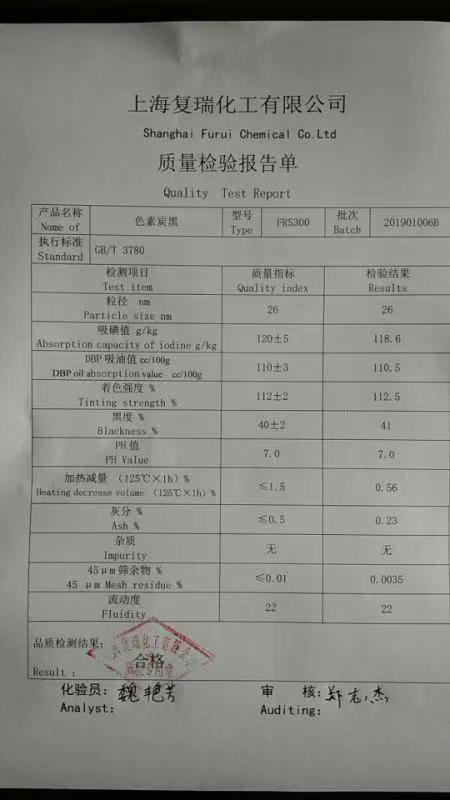 上海复瑞化工有限公司是一家集生产,科研,销售为一体的现代化内迁合作企业。公司已形成一套复瑞特色的融军营文化为一体的企业文化和现代化企业管理制度,并培养出一批高素质的员工队伍。其中大专以上学历占80%,中高级以上职称的占20%。 目前公司有8000吨/年炉法色素碳黑生产线一条,主要用于塑胶色母、色浆、造纸中,其中开发的用于密封胶和防水材料的品种特别深受国内外客户的好评。有3000吨/年专门用于油墨涂料和皮革等产品的槽法生产线一条,其中开发的度结构高流动性的色素碳黑很受油墨行业欢迎。
