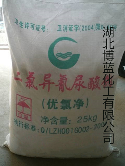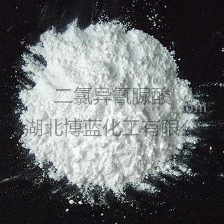 二氯异氰尿酸钠作用用途:杀菌、消毒、除藻。二氯异氰尿酸是一种高效、广谱、新型内吸性杀菌剂,有极强的杀生作用,在20ppm时,杀菌率达到99%。可杀灭各种细菌、藻类、真菌和病菌。二氯异氰尿酸钠化学性质稳定,干燥条件下保存半年内有效氯下降不超过1%便于贮存运输;使用安全、简便、用量少、药效持续时间长。可强力杀灭细菌芽孢、细菌繁殖体、真菌等各种致病性微生物,对肝炎病毒有特效杀灭作用,快速杀灭并强力抑制循环水、冷却塔、水池等系统的蓝绿藻、红藻、海藻等藻类植物。对循环水系统的硫酸还原菌、铁细菌、真菌等有彻底的杀灭作用。二氯异氰尿酸钠作用机理为:喷施在作物表面能慢慢地释放次氯酸,通过使菌体蛋白质变性,改变膜通透性,干扰酶系统生理生化及影响DNA合成等过程,使病原菌迅速死亡熔点:240℃~250℃,熔点以上分解中文别名:优氯净;优乐净;NaDCC;消杀威技术指标:外 观:白色粉状或颗粒,有特殊的刺激性气味。溶解度:易溶于水。有效氯含量%≥:粉状56%;颗粒60%1%溶液PH值:粉状5.5-7.0;颗粒5.5-7.0水分%:粉状5-12;颗粒2-7