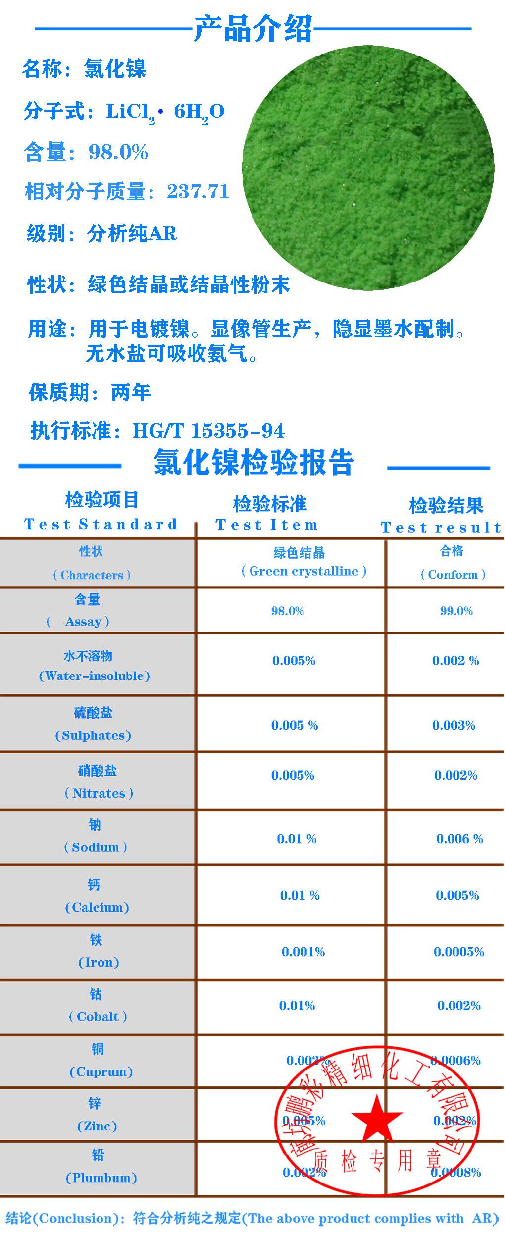 关键字: 六水氯化镍;分析纯六水氯化镍;试剂级六水氯化镍;分析纯六水氯化镍;