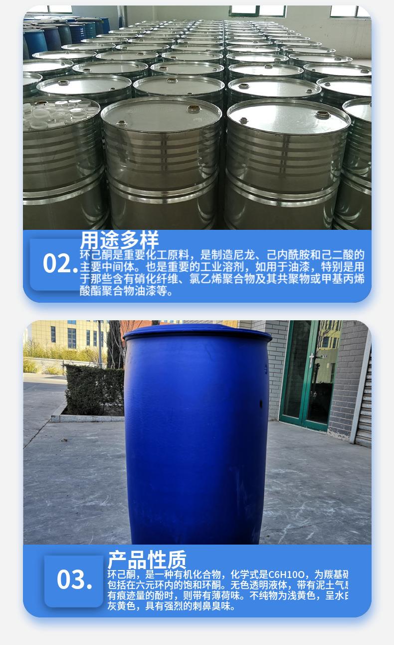 环己酮是重要化工原料,是制造尼龙、己内酰胺和己二酸的主要中间体。也是重要的工业溶剂,如用于油漆,特别是用于那些含有硝化纤维、氯乙烯聚合物及其共聚物或甲基丙烯酸酯聚合物油漆等。用于有机磷杀虫剂及许多类似物等农药的优良溶剂,用作染料的溶剂,作为活塞型航空润滑油的粘滞溶剂,脂、蜡及橡胶的溶剂。也用作染色和褪光丝的均化剂,擦亮金属的脱脂剂,木材着色涂漆。用作指甲油等化妆品的高沸点溶剂。通常与低沸点溶剂和中沸点溶剂配制成混合溶剂,以获得适宜的挥发速度和黏度。