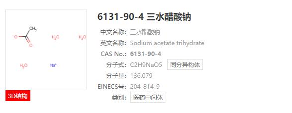 中文同义词:三水醋酸钠;醋酸钠;3M乙酸钠缓冲液(PH5.2);三水乙酸钠;三水醋酸钠(乙酸钠);三水合乙酸钠,结晶醋酸钠,结晶乙酸钠;乙酸钠,三水;乙酸钠三水合物英文名称:Sodiumacetatetrihydrate英文同义词:Aceticacid,sodiumsalttrihydrate,foranalysis;Aceticacid,sodiumsalttrihydrate,foranalysisACS;Aceticacidsodiumtrihydrate;Aceticacidsodium·trihydrate;SodiumAcetateTrihydrate,Acs-100.5%;Aceticacid,sodiumsalttrihydrate,foranalysisACS,99+%;SodiuMAcetate(AS);SodiuMAcetate,Trihydrate,HPLCGradeCAS号:6131-90-4分子式:C2H9NaO5分子量:136.08EINECS号:612-115-9