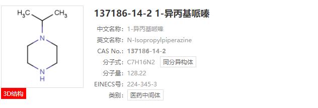 中文同义词:1-异丙基哌嗪;N-异丙基哌嗪;1-异丙基哌啶;1-异丙基哌嗪(CAS号:137186-14-2)英文名称:N-Isopropylpiperazine英文同义词:RARECHEMAHCK0183;N-ISOPROPYLPIPERAZINE;TIMTEC-BBSBB004236;ISOPROPYLPIPERAZINE;1-(Isopropyl)piperazine;IFLAB-BBF1929-1669