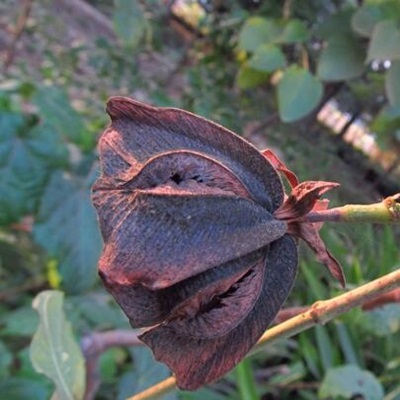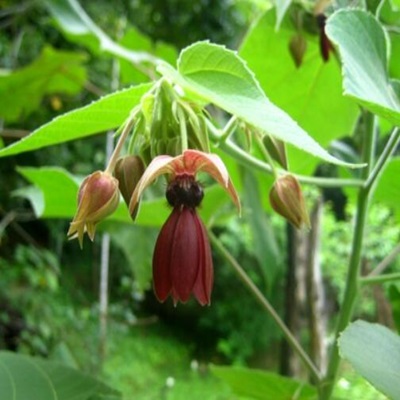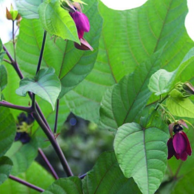 昂天莲 灌木,高1-4m。幼枝密被星状茸毛。叶互生;叶柄长1-10cm;托叶条形,长5-10mm,脱落;叶片心形或卵状心形,有时为3-5浅裂,长10-22cm,宽9-10cm,先端急尖或渐尖,基部心形或斜心形,上面无毛或被稀疏的星状柔毛,下面密被短茸毛;基生脉3-7条,叶脉在两面均凸起。聚伞花序具1-3朵花,萼片5,披针形,近基部连合,长15-18mm,两面均密被柔毛;花瓣5片,红紫色,匙形,长达2.5cm,先端急尖或钝,基部凹陷且有毛。种子多数,长圆形,黑色,长约2mm。