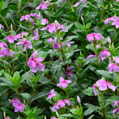 长春花全株无毛或仅有微毛,略有分枝,形状近方形,有条纹,呈灰绿色;叶膜质,倒卵状长圆形;花有红、紫、粉、白、黄等多种颜色,聚伞花序腋生或顶生;种子黑色,长圆状圆筒形;花期、果期几乎全年。