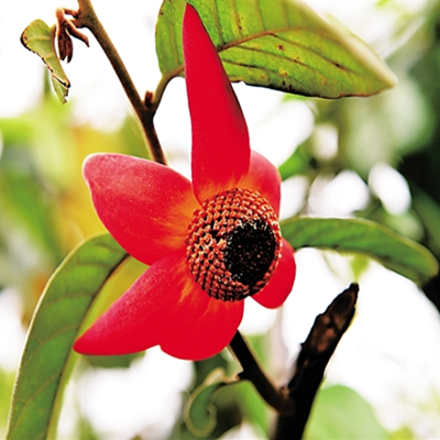 大花紫玉盘为番荔枝科、紫玉盘属攀援灌木。果实名为山椒子,椭圆状,金黄色,就像一个个长长的辣椒。花果期均达半年以上,既能观花又能食果,根叶还可作药,有驱虫、抗微生物、抗肿瘤细胞毒性、抗寄生虫、抗疟活性及抗肿瘤多药耐药活性。