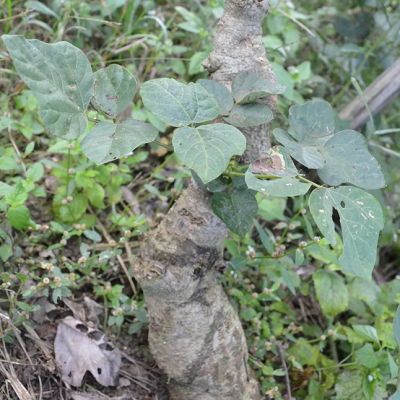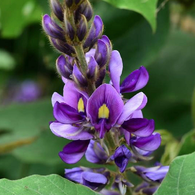 缠绕藤本,被褐色短柔毛和倒生硬毛,有肥厚的块根。叶互生,为三出复叶,托叶以中部着生,披针状长圆形,有多条直出平行脉,被贴伏长硬毛;小叶阔卵形或卵状菱形,顶端短渐尖,基部阔而圆,两面被糙伏毛;小托叶线形。腋生总状花序,总轴被黄色茸毛;苞片钻形,早落;花冠蝶形,紫色,基部有内折的耳及硬痂状附属体,翼瓣倒卵状长圆形,基部二侧具小耳,龙骨瓣镰状长圆形,基部近截平;雄蕊10枚;子房线形,花柱弯曲。荚果长椭圆形,扁平,密被褐色长硬毛。种子肾形或圆形。花期夏末秋初。