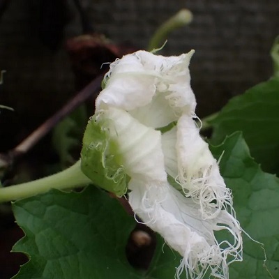 多年生草质藤本,长达10米。块根肥厚。茎攀援,多分枝,表面有浅纵沟,光滑无毛;卷须腋生,细长,先端2歧。叶互生;叶片近圆形或近心形,长宽各8~20厘米,常为5~7浅裂或中裂,少为3裂,裂片倒卵形、矩圆形、椭圆形至矩圆状披针形,先端急尖或短渐尖,边缘有疏齿或再作浅裂,幼时两面疏生柔毛,老时下面有粗糙斑点。花单性,雌雄异株;雄花3~8,排列成总状花序,有时单生;萼筒状,长2.5~4厘米,萼片5,线形,稍反卷,长1~1.5厘米;花冠白色,裂片5,倒卵形,先端细裂成流苏状;雄蕊3,花丝长4~6毫米;雌花单生,萼、瓣与雄花略同;子房下位,长卵形,花柱长,柱头3深裂,呈丝状。瓤果卵圆形至广椭圆形,熟时橙黄色,光滑。种子多数,扁平,长方卵形或圆卵形,边缘有线纹状形成窄边,熟时黄棕色。花期7~8月。果期9~10月。