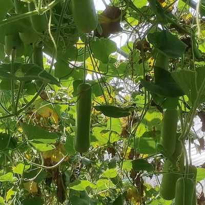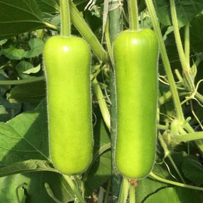 为葫芦的变种,一年生攀援草本。茎、枝具沟纹,被粘质长柔毛,老后渐脱落,变近无毛。叶柄纤细,长16-20厘米。卷须纤细,初时有微柔毛,后渐脱落,变光滑无毛,上部分2歧。雌雄同株,雌、雄花均单生;子房圆柱状,花柱粗短,柱头3,膨大,2裂。果实初为绿色,后变白色至带黄色,由于长期栽培;果形变异很大,因不同品种或变种而异,果实粗细匀称而呈圆柱状,直或稍弓曲,长可达60-80厘米,绿白色,果肉白色。种子白色,倒卵形或三角形,顶端截形或2齿裂,稀圆,长约20毫米。