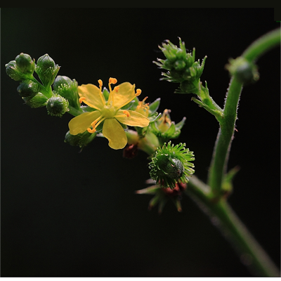 龙牙草属多年生草本,高30~60厘米。根肥大,圆锥状。根状茎短,基部常有1至数个地下芽;茎高达1.2米,被疏柔毛及短柔毛,稀下部被长硬毛;叶为间断奇数羽状复叶,常有3~4对小叶,杂有小型小叶;小叶倒卵形至倒卵状披针形,具锯齿;穗状总状花序,花瓣黄色,长圆形;雄蕊5至多枚,花柱2个;瘦果倒卵状圆锥形,顶端有数层钩刺。花期6~8月,果期8~10月。