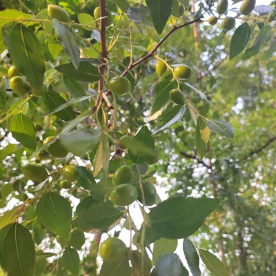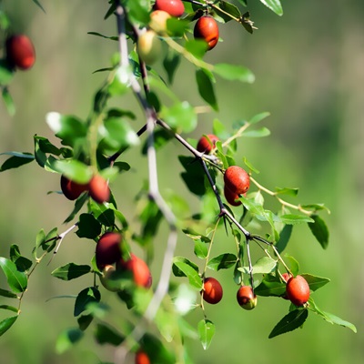 酸枣为鼠李科枣属的落叶灌木或小乔木。果实呈椭圆形或圆形,成熟时颜色由绿色转为红色或深紫色,果肉酸甜可口,富含维生素C和多种矿物质,具有较高的营养价值。种子可入药,中药名为酸枣仁,具有养心补肝,宁心安神,敛汗,生津的功效,可用于治疗虚烦不眠,惊悸多梦,体虚多汗,津伤口渴。