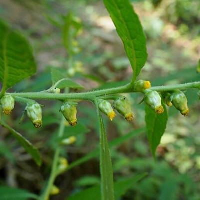 天名精为多年生草本;茎直立,上部多分枝呈二叉状;茎下部的长椭圆形叶子互生;头状花序多数,腋生半下垂,夏秋开黄色管状花;褐黑色瘦果。