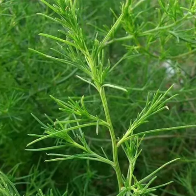 猪毛蒿为菊科蒿属植物,别名滨蒿、石茵陈和山茵陈等。其外形近似于茵陈. A. capillaris Thunb.,过去也有学者将本种作为茵陈蒿的变种A. Papillaris Thunb. var. scoparia (Waldst. et Kit.) Pamp.。与茵陈蒿的区别在于本种为多年生或近一、二年生草本,茎基部叶二至三回羽状全裂;中部叶长圆形或长卵形,一至二回羽状全裂,小裂片细,为狭线形、细线形或毛发状;头状花序小,直径1-1.5(-2)毫米,在分枝上排成复总状或复穗状花序,并在茎上组成大型开展的圆锥花序。基生叶、幼苗及幼叶等入药,民间称“土茵陈”,化学成分、功用等与“茵陈蒿”同。