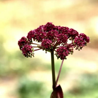 紫花前胡是伞形科当归属植物,多年生草本。又名土当归、鸭脚七、野辣菜、山芫荽、桑根子苗、鸭脚前胡、鸭脚板等。根圆锥状,有少数分枝,径1-2厘米,外表棕黄色至棕褐色,有强烈气味。茎高1-2米,直立,单一,中空,光滑,常为紫色,无毛,有纵沟纹。根生叶和茎生叶有长柄,柄长13-36厘米,基部膨大成圆形的紫色叶鞘,抱茎,外面无毛;叶片三角形至卵圆形,坚纸质,长10-25厘米,一回三全裂或一至二回羽状分裂;翅边缘有锯齿;末回裂片卵形或长圆状披针形,长5-15厘米,宽2-5厘米,顶端锐尖,边缘有白色软骨质锯齿,齿端有尖头,表面深绿色,背面绿白色,主脉常带紫色,表面脉上有短糙毛,背面无毛;茎上部叶简化成囊状膨大的紫色叶鞘。