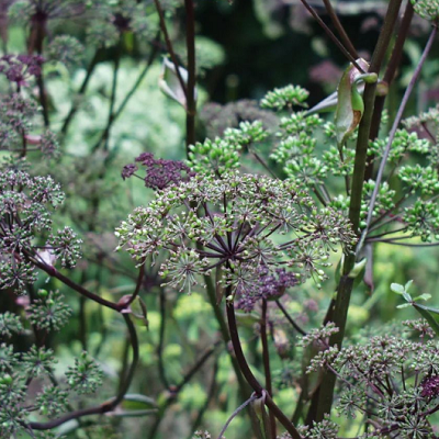 多年生草本,高1-2m。根圆锥形,常数支根,表面黄褐色至棕褐色。茎直立,圆柱形,具浅纵沟纹,光滑,紫色,上部分枝被柔毛。根生叶和茎生叶有长柄,柄长13-36cm,基部膨大成圆形的紫色叶鞘,抱茎外,面无毛;叶片三角形至卵圆形,坚纸质,长10-25cm,一回三全裂或片和顶端叶片有基部联合,沿叶轴呈翅状延长,侧方裂片和顶端叶片有基部联合,沿叶轴呈翅状延长,侧方裂片和顶凋叶片有基部联合,沿叶轴叶翅状延长,翅边缘有锯齿;末回裂片卵形或长圆状披针形,长5-15cm,宽2-5cm,先端锐尖,边缘有白色软骨质锯齿,齿端有尖头,上面深绿色,脉上有短糙毛,下面绿白色,主脉常带紫色,无毛;茎上部叶简化成囊状膨大的紫色叶鞘。复伞形花序顶生和侧生,花序梗长3-8cm,有柔毛;伞辐10-22,长2-4cm;总苞片1-3,卵圆形,阔鞘状,宿存,反折,紫色;小总苞片3-8,线形至披针形,无毛;伞辐及花柄有毛;花深紫色;萼齿明显,线状锥形或三角状锥形;花瓣倒卵形或椭圆状披针形,先端通常不内折成凹头状;花药暗紫色。果实长圆形至卵状圆形,长4-7mm,宽3-5mm,无毛,背棱线形隆起,尖锐,侧棱有较厚的狭翅,与果体近等宽,棱槽内有油管1-3,合生面有油管4-7mm,宽3-5mm,无毛,背棱线形隆起,尖锐,侧棱有较厚的狭翅,与果体近等宽,棱槽内有油管1-3,合生面有油管4-6,胚乳腹面有油管4-6,胚乳腹面凹入。花期8-9月,果期9-11月。